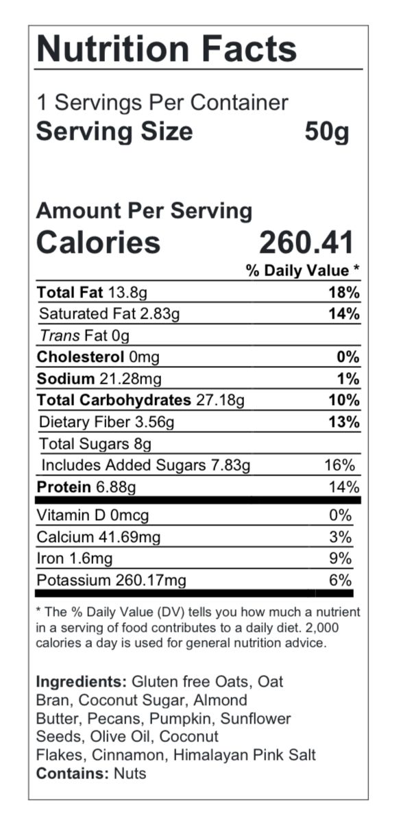 Get our flagship granola flavor in a value 1kg bag. It will pleasantly surprise you with Pecan nuts and Coconut flakes. Made with heart healthy ingredients and whole grains, it contains up to 50% of seeds and nuts and it is cholesterol free.