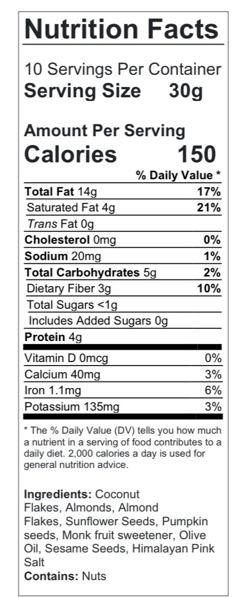 Contains hearth healthy nuts, our keto granola is free of sugar. Diabetic friendly and it is a high source of protein and fiber. If you are on Keto diet this is your go to option granola (made with Monk-fruit Sweetener).