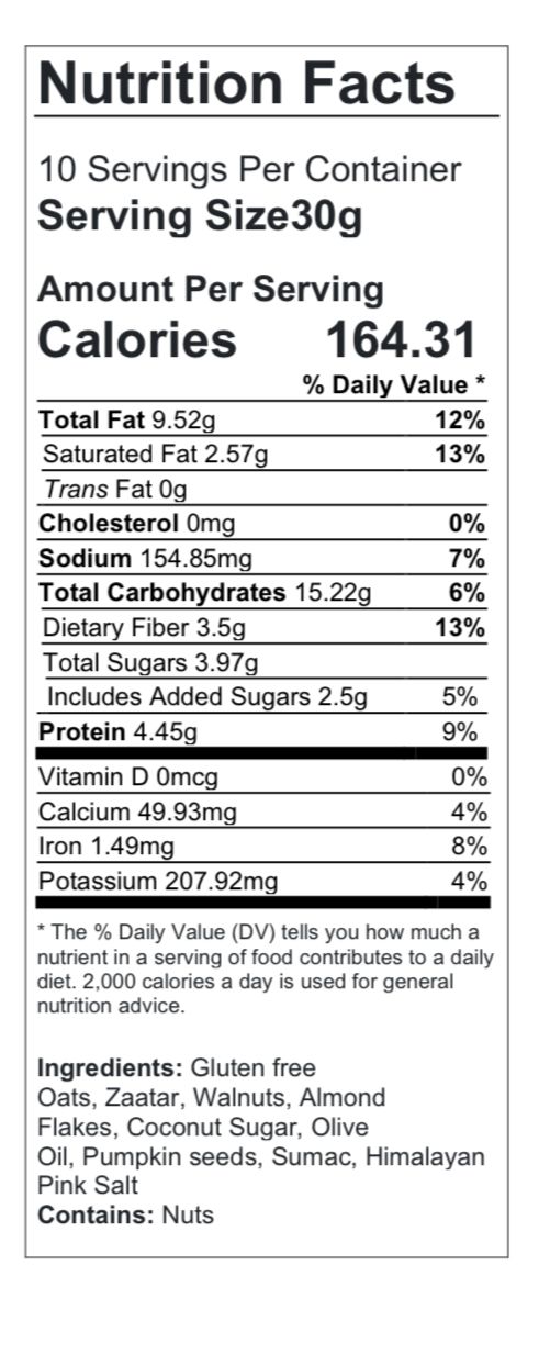 Enjoy original taste of Oloaa Zaatar granola – salty, yet sweet with Zaatar and Sumac. Our paleo friendly Zaatar granola is made with Goodness! No artificial flavors or preservatives, packed with Omega 3-rich ingredients what makes it good for your gut health and digestion system.