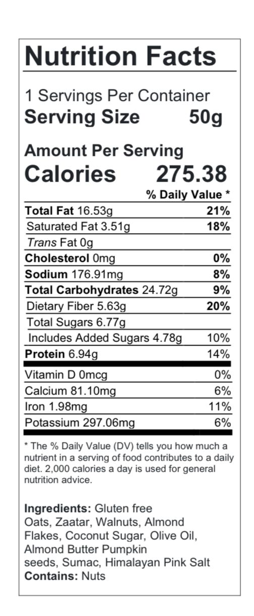Enjoy original taste of Oloaa Zaatar granola bar – salty, yet sweet with Zaatar and Sumac. Our paleo friendly Zaatar bar is made with Goodness! No artificial flavors or preservatives, packed with Omega 3-rich ingredients what makes it good for your gut health and digestion system.